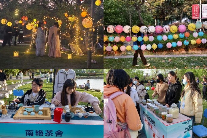 青衿汉宣社学子广袖飘飘,自三期校园款款而行,汉服游园为活动拉开序幕。艺术楼前,一曲《高山流水》典雅古朴,《霓裳羽衣》演绎传统与现代的完美交融。一期湖畔边,电子爱好者协会流光溢彩的电子花灯引人驻足;南艳茶舍的学子们碾茶煮茗,体味“晴窗细乳戏分茶”的雅致。生物创新之光协会的佳酿、灵心居手工社的巧手生花、ART手绘协会的妙笔丹青,无不展现着传统文化的当代活力。月上柳梢时,猜灯谜、放河灯等传统活动将气氛推向高潮。盏盏花灯随波远去,载着学子们的美好祈愿;笑语欢声间,沙包投掷、寻宝探险等活动更添趣味。此次花灯节不仅丰富了校园文化生活,更让传统文化浸润学生的心田。