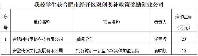 在获此次资助之前,我校另有2家公司获“合肥经开区双创奖补政策奖励”,该奖励是针对国家、省、市各级政府部门举办的创新创业项目大赛中获奖的创业项目,其中国家级奖补金额为20万,省级奖补金额为10万,市级奖补金额为5万。