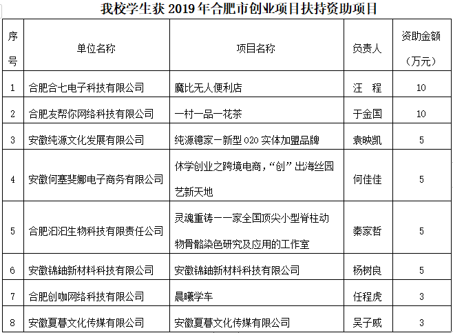 为大力推动大众创业、万众创新,鼓励高校在校生及毕业生创新创业,以创业带动就业,2019年12月合肥市遴选资助一批高校毕业生创业项目,资助对象为全市高校在校生或毕业5年内的毕业生。通过项目申报、区人社部门推荐、市人社部门审核,全市遴选出101个创业项目,其中18个创业项目获10万元资助,41个创业项目获5万元资助,42个创业项目获3万元资助。我校大学生创业园共有8个创业项目获得资助,其中2个项目获10万元创业资助,4个项目获5万元创业资助,2个项目获3万元创业资助,资助数量位居全市第一。