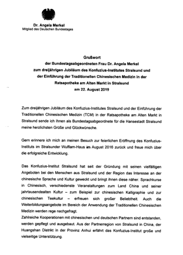 Dreijähriges Jubiläum der Eröffnung des Konfuzius-Instituts Stralsund und die Glückwünsche von Bundeskanzlerin Angela Merkel