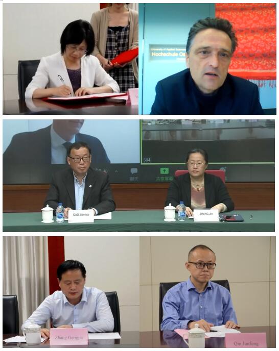 Um die deutsch-chinesische Zusammenarbeit weiter zu fördern, die Kooperationsinhalte zu erweitern und in die integrierte Entwicklung des Jangtse-Deltas einzubinden,  unterzeichnete die Universität Hefei am 27. Mai einen trilateralen Hochschul-Kooperationsvertrag mit der Shanghai Open University und der Hochschule Osnabrück. Präsidentin der Universität Hefei Wu Chunmei, Vizepräsidentin Chen Xiu, der stellvertretende Sekretär der Shanghai Open University Gao Jianhua, Vizepräsident Zhang Jin, Präsident der Hochschule Osnabrück Bertram und Vizepräsident Lehrersdorf unterzeichneten gemeinsam den Vertrag. Die Zusammenarbeit zwischen den drei Hochschulen wird auch vom Amt für auswärtige Angelegenheiten der Volksregierung der Provinz Anhui und dem Bildungsministerium der Provinz  Anhui sehr geschätzt. Qin Junfeng, stellvertretender Direktor des Amtes für auswärtige Angelegenheiten, und Zhang Gengjia, stellvertretender Direktor des Bildungsministeriums, nahmen  an der Unterzeichnungszeremonie teil. Die Zeremonie wurde von Chen Xiu moderiert.