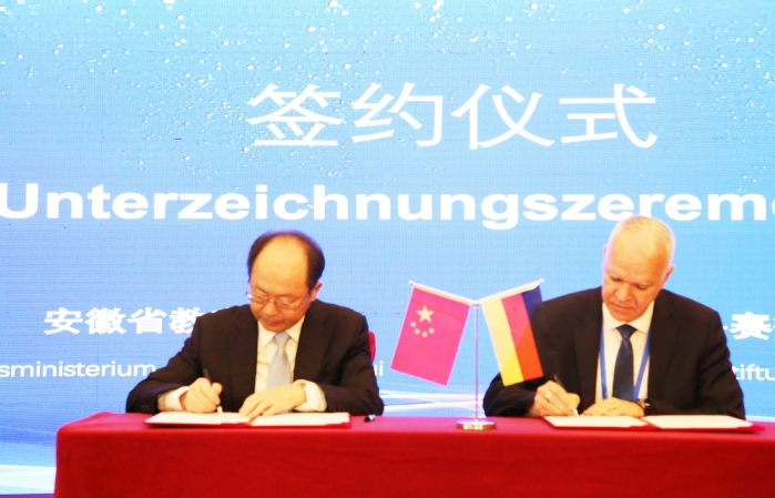 Die Unterzeichnungszeremonie fand anschließend statt. Qian Guilun und Georg Stadler unterzeichneten als Vertreter beider Seiten eine Kooperationsvereinbarung. In Zukunft werden beide Seiten bei den Ausbildungen über die Themen Forschung über das Lehrprogramm, Förderung der Lehr- und Praxisfähigkeit von Lehrkräften und Einführung praxisorientierter Lehrkonzepte, dem Aufbau von Ausbildungszentren und dem Aufbau von Lehrqualitätsmanagementsystemen zusammenarbeiten, um den Austausch und die Freundschaft zwischen China und Deutschland im Bildungsbereich weiter zu stärken und die Entwicklung der beruflichen Bildung in der Provinz Anhui zu fördern.