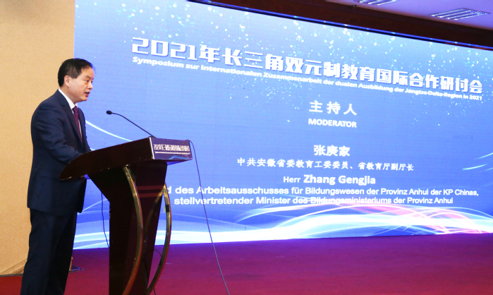 Am Morgen des 6. Juli fand in Hefei das Symposium zur internationalen Zusammenarbeit der dualen Ausbildung der Jangtse-Delta-Region statt, das vom Ministerum für Bildungswesen der Provinz Anhui gesponsert und von der Universität Hefei veranstaltet wurde. Mehr als 190 Vertreterinnen und Vertreter von 79 Hochschulen und Unternehmen nahmen an der Konferenz teil, um über Erfahrungen zur internationalen Zusammenarbeit in der dualen Ausbildung zu diskutieren und sich auszutauschen. Die Eröffnungszeremonie wurde von Zhang Gengjia geleitet, einem Mitglied des Bildungs- und Industrieausschusses des Provinzkomitees der Kommunistischen Partei Chinas in Anhui und stellvertretender Direktor des Ministerums für Bildungswesen der Provinz Anhui.
