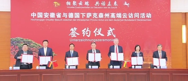 Am 16. Juli hielten die Provinz Anhui und das deutsche Bundesland Niedersachsen eine Videokonferenz zum Thema Virtuelles Zusammentreffen zur Diskussion über die Zukunft — Hochrangiger Virtueller Besuch zwischen der chinesischen Provinz Anhui und dem deutschen Bundesland Niedersachsen ab. An der Veranstaltung nahmen Li Jinbin, Sekretär des Komitees der Kommunistischen Partei der Provinz Anhui, Wang Qingxian, Gouverneur der Volksregierung der Provinz Anhui, Stephan Weil, Niedersächsischer Ministerpräsident, Zhang Xi, Vizegouverneur der Volksregierung der Provinz Anhui, Du Xiaohui, chinesischer Generalkonsul in Hamburg, Thomas Triller, amtierender deutscher Generalkonsul in Shanghai, und Wu Chunmei, Präsidentin der Universität Hefei teil.