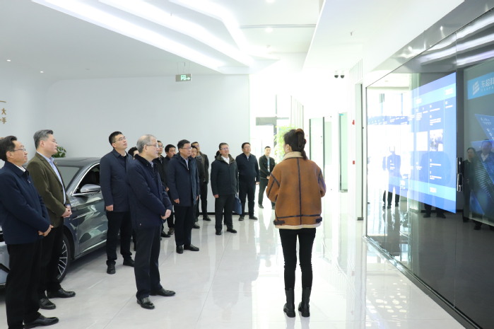 在黄磊陪同下,中心组一行走进东超科技企业展厅,听取了企业情况介绍,现场体验了“无介质空中悬浮成像”技术在智能座舱、医疗卫生、民生工程、智慧家居、展览展示等领域的最新创新与研发成果。