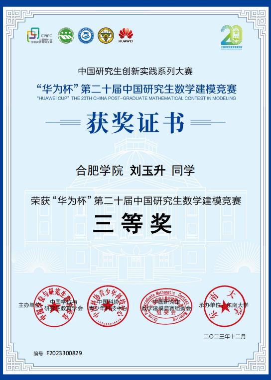 刘玉升始终秉持“以赛促学、以赛促研”的理念,积极参与各类高水平学科竞赛,在实践中不断拓展学术视野、提升创新能力。在2023年“华为杯”第二十届中国研究生数学建模竞赛中,他带领团队克服重重困难,最终荣获国家三等奖。