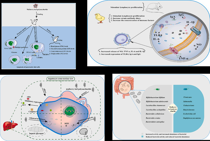 桑叶多糖的降血糖活性、免疫活性、肝细胞保护和肠道菌群影响机制图