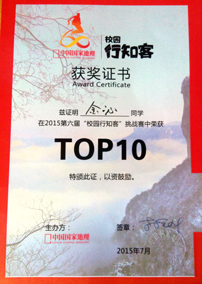 《中国国家地理》第六届“校园行知客”挑战赛于今年4月启动,本次比赛以“为爱远征”为主题,以贵州、湖南、青海、西藏等十个省为目的地赛区,倡导进行有深度有意义的行走,在认识中国、记录中国的路上寻找、发现、创造爱。我校2013研究生金沁同学以《站站乐——用铁轨丈量贵州》的旅行计划参加此次比赛,并从全国近3000名报名选手中经层层选拔,以30强身份进入复赛,在重庆金佛山的复赛过程中通过户外拓展、徒步、露营、主题表演、梦想答辩等考察环节,充分展示了个人性格、沟通能力、面对陌生环境的适应能力等综合素质,最终入围本届“校园行知客”挑战赛TOP10,并获得旅行基金和装备。