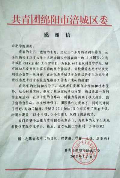 今年,来自全国113支高校志愿者团队报名参加本次2015加油乡村夏令营活动,合肥学院“微爱”团队以全国第二的名次获得项目执行资格,并在七月初奔赴四川绵阳参加社会志愿活动,参加了西南科技大学的五天成长营培训在绵阳丰谷镇致富村、廻龙沟的两期夏令营营会。据悉,共青团绵阳市涪城区委在给合肥学院团委的感谢信中写道:贵校微爱志愿者团队受到社会各界一致好评,希望今后能与贵校团委长期合作,为更多的大学生志愿者提供实践交流平台。