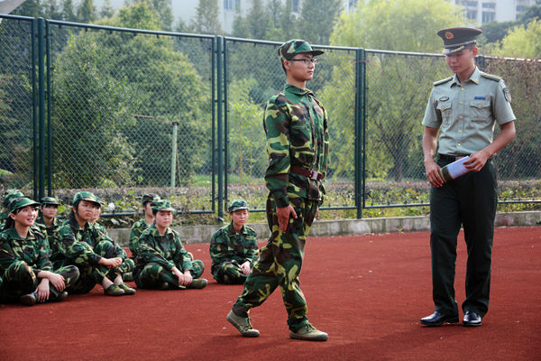 “稍息,立正,向右看齐——”,教官洪亮的口令声一响起,整齐的小碎步便随之迈起,队形在转瞬之间变得整齐划一,而后四周便安静得只剩下平缓的呼吸声了。整队完毕后,各连队便进入了站军姿、齐步、正步等紧张训练中。“虽然每次训练都很累,但这却使我认识了许多人,令我很快乐、很开心。”外语系的严敏同学在休息期间这样说道,其实军训并没有想象中的那么累,而且天气也不热。