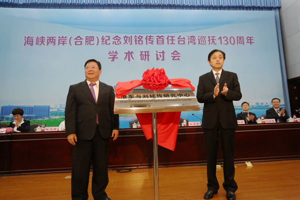 9月24日,海峡两岸(合肥)纪念刘铭传首任台湾巡抚130周年学术研讨会在肥举行。开幕式上,海峡两岸关系协会副会长孙亚夫安徽省人民政府副省长谢广祥为“合肥学院淮军与刘铭传研究中心”揭牌。
