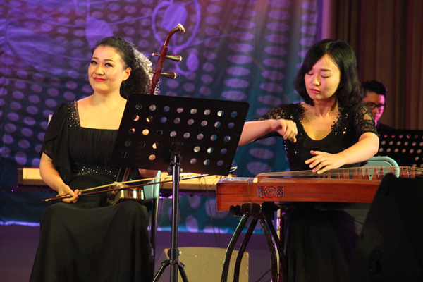 音乐会在悠扬的二胡声中拉开帷幕,开场的第一曲新民乐《加勒比海盗》让人感受到古典乐器与现代乐器的碰撞所带来的美感与力量,舞台灯光随节奏闪烁,台下听众的心情也跟着音乐徜徉。节奏感极强的摇滚乐《无所顾忌》,轻松活泼的《Crazy》富有感染力的旋律,动感时尚的节拍,时而喧嚣激昂铮铮跳跃,时而柔媚婉转低吟浅唱,时而激越迸发金鼓齐鸣,时而万籁俱寂烟消云散,无不张扬着青春与活力,使现场气氛再次升温。身着白底蓝花点缀礼服的徽姑娘组合将黄梅戏《对花》注入流行音乐因素,别有一番风味。著名美声艺术家闫晓光带来的独唱《今夜无人入睡》,用他极富穿透力的浑厚嗓音,绝佳的演唱技巧,深情讲述着唯美的故事,吸引着现场的观众。第二季《中国好声音》汪峰组学员倪鹏更是带来自创歌曲《此时此刻》,歌声率性洒脱、朝气蓬勃,鼓励我校学生勇敢地奔向前方。音乐会在《我爱你中国》的合唱中落下帷幕。台上激昂悠扬的歌声不绝于耳,台下的观众纷纷打开照明灯,挥动着手臂,随着歌曲打节拍。现场顿时变成音乐的海洋。
