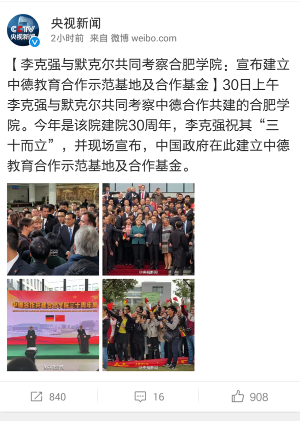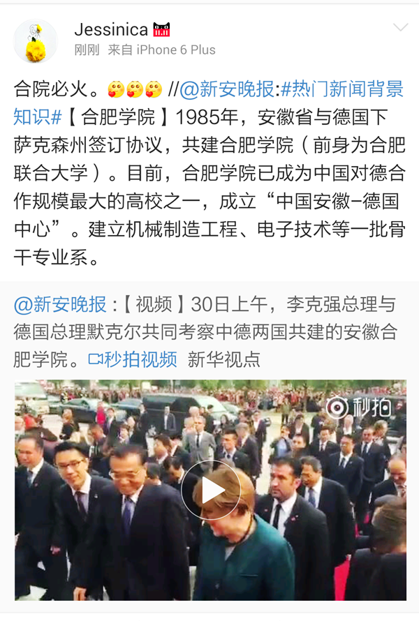总理来访合肥学院,全校师生纷纷转载总理来访动态,微博、空间、朋友圈均被2015年10月30日的消息“刷屏”。