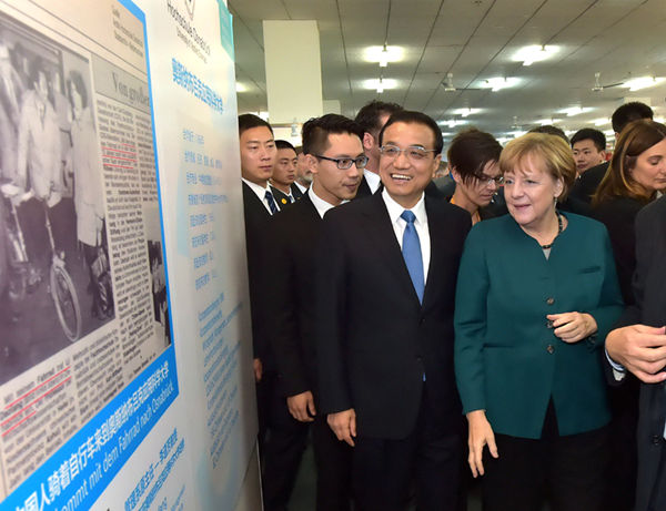 两国总理饶有兴致地观看了中德合作共建合肥学院30周年的视频和图片展,李克强与默克尔同在场的中德两国专家、师生和校友代表互动交流,参观了学生自己设计并已投入市场的产品,在食品展区还品尝了中德两国学生合作酿制的啤酒,总理在与学生交流中鼓励合肥学院学生好好学习,将来有所成就。