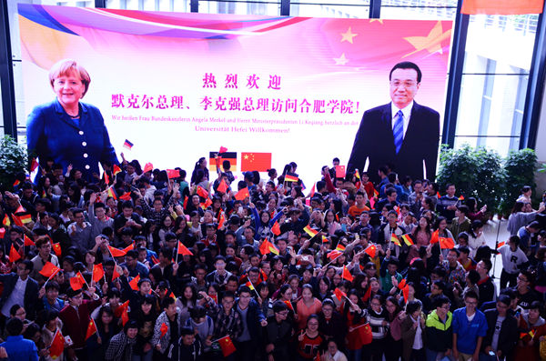 两位总理的到来在校园引起轰动。合肥学院全体师生们挥舞着中德两国国旗,高呼“总理好”,高举着“中德两国友谊地久天长”“总理我们爱您”“总理您辛苦了”等自制的牌子,李克强和默克尔一道在人群簇拥中与青年学子们热情握手并亲切交流。
