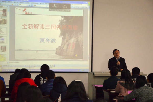 11月14日上午,由我校省人文社科重点研究基地“环巢湖文化与经济社会发展研究中心”主办,校团委协办的“安徽历史文化”系列讲座在我校图书馆读者培训室举行。本次讲座邀请了中国作家协会会员、著名三国文化研究专家夏冬波作了“全新解读三国名将周瑜”的主题讲座,来自我校各系的近百名同学聆听了夏先生的精彩演讲。