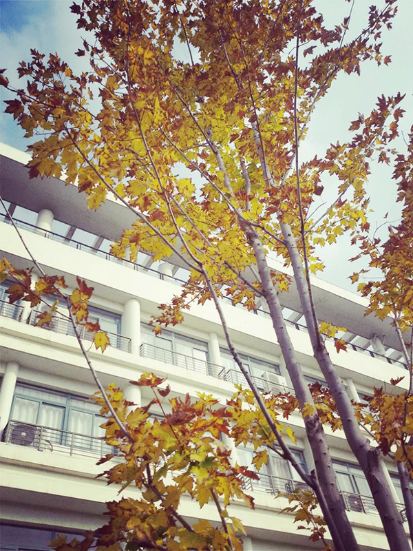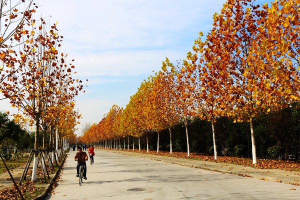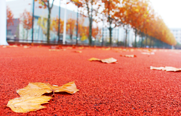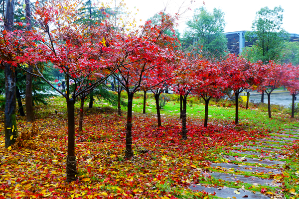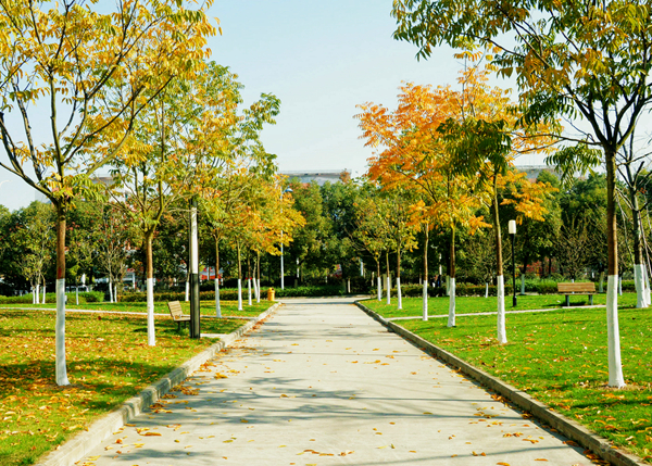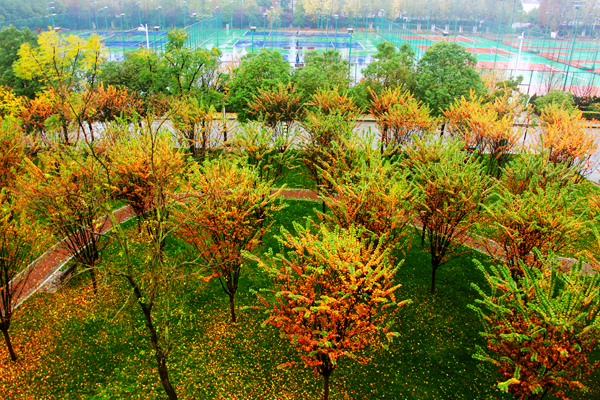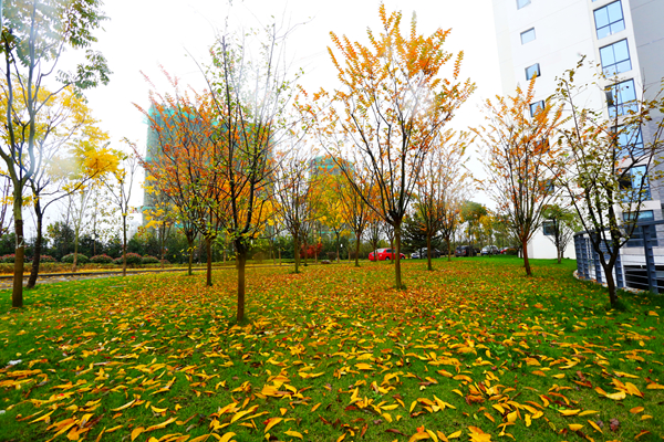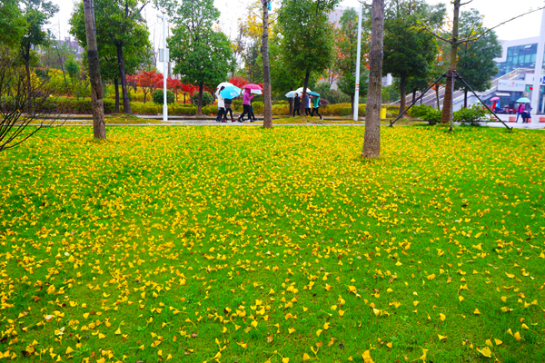一区教学楼间草色长青,并未曾因秋而萧索。草地上,海棠叶落,点点金黄洒落其间。微雨间,多少来往学生俯拾秋情。艺术楼前银杏盘旋,跳跃着生命中最优雅的舞蹈,悄落在伞上、阶上。二区校道上雨湿苍苔,梧桐滴答。操场的红色塑胶跑道上,大大小小的梧桐叶静静卧着,倾听者漫步者的低低沉吟,或被跑步经过的脚步带起轻轻的跳跃。