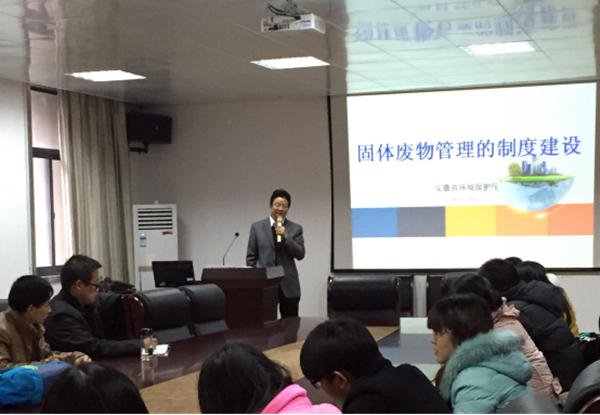 11月25日,安徽省环保厅副厅长、我校硕士生校外导师殷福才教授应邀以“固体废弃物管理的制度建设”为题,给我校2015级环境工程专业研究生作了一场精彩的报告。首先,殷厅长阐述了我国固体废弃物管理及处置机构以及固体废弃物的管理制度,包括进口许可制度、减量化制度、跨界转移许可制度、特许经营制度、申报登记制度和医疗废物管理制度等。其次,他客观分析了我国固体废弃物管理存在的问题。如固体废弃物监管能力不足,认识不到位;危险废弃物鉴别基础工作较为薄弱;危险废弃物处置能力严重不足;城市建筑垃圾和生活垃圾污染严重;企业规范化管理水平普遍较低;工业固体废弃物局部地方污染严重;非法跨境转移和倾倒屡禁不止;农村生活垃圾处理难等问题。最后,他还以城市生活垃圾焚烧利用——铜陵海螺水泥项目、合肥市吴山固体废弃物处置有限责任公司和滁州超越固体废弃物处置中心为例,阐述了我省固体废弃物处理处置的发展现状以及未来的发展方向。