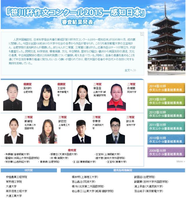 近期,由人民中国杂志社、日本科学协会、中国青年报联合举办的2015年感知日本笹川杯第五届全国作文大赛获奖选手照片公布在“人民中国杂志社”主页。我校外语系13级日语班奚相昀同学以全国前二名的好成绩荣获一等奖,作为奖励,奚相昀同学受主办方邀请,免费参加为期八天的感知日本访日活动。13级日语班黄倩倩同学获优秀奖。刘亚钰老师获“优秀指导教师奖”。