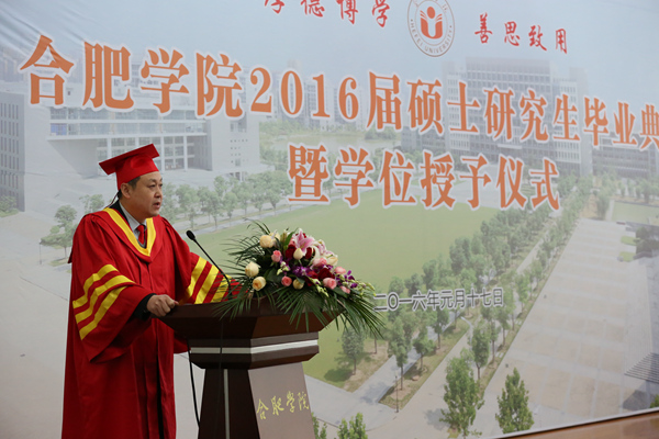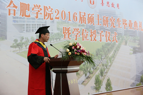 毕业典礼在庄严的国歌声中开始。合肥学院硕士研究生学位评定委员会委员、校党委副书记丁明教授首先宣读了合肥学院硕士研究生学位评定委员会“关于授予2016届环境工程专业徐芳丽等29名研究生工程硕士学位的决定”和 “关于表彰合肥学院2016届环境工程专业硕士研究生科研成果奖、优秀毕业生、优秀毕业论文和‘合大环保奖学金’获得者的决定”。