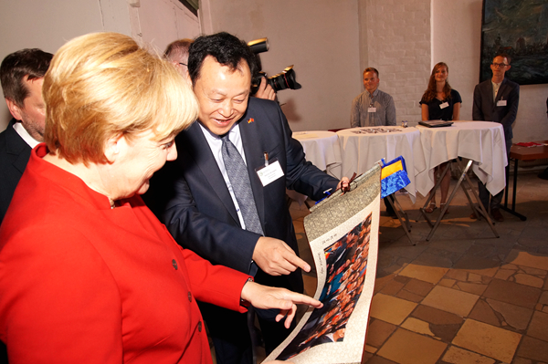 去年10月30日,中德两国总理共同访问了安徽合肥,在他们见证下我校与施特拉尔松德应用科学大学签署了共建孔子学院执行协议。揭牌前,默克尔首先在孔子学院签字薄上签名留念,并在中国驻德国大使史明德、国家汉办主任许琳等陪同下饶有兴趣地参观了去年其访问我校的图片展,更愉快地回忆起了当时的情形。校党委书记蔡敬民代表我校向默克尔展示并赠送了由去年她与李克强总理共同访问学校期间与师生合影制成的纪念品,默克尔欣然接受,并对我校在促进中德高校合作中所发挥的积极作用表示赞赏和欣慰。