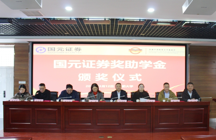 3月12日下午,2022-2023学年国元证券奖助学金颁奖仪式在一期6号楼学术报告厅举行。国元证券股份有限公司党委副书记、监事会主席、工会主席蒋希敏,我校副校长、安徽中德教育合作基金会理事长陈秀出席仪式,基金会管理办公室主任刘金平、经济与管理学院院长陈江华、相关负责老师及获奖助学生参加仪式。仪式由经济与管理学院党委书记倪泽强主持。