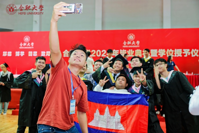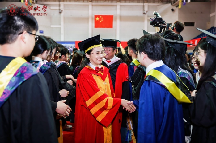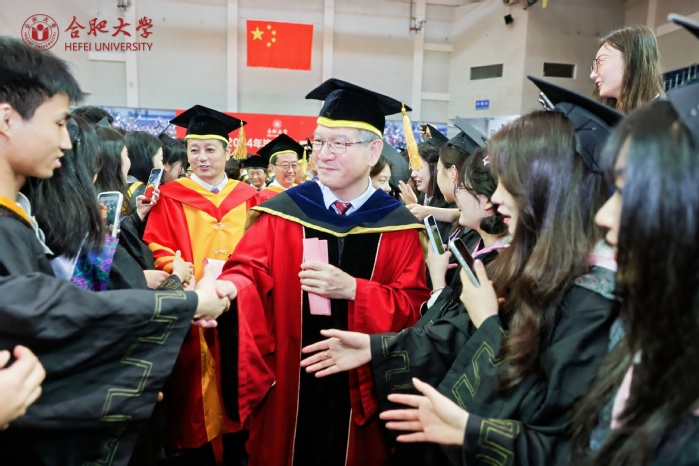 典礼最后,校领导、校学位评定委员会成员与在场毕业生握手送别、合影留念。