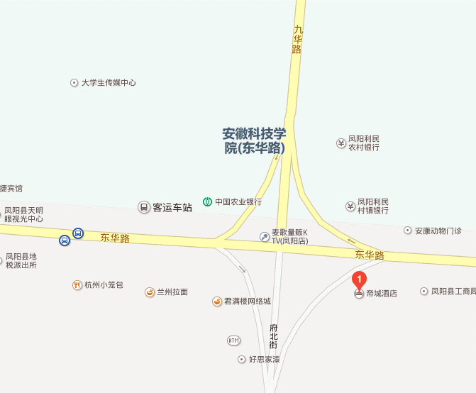 1、汽车:A、凤阳汽车站(安徽科技学院南门);B、蚌埠汽车站-凤阳汽车站(安徽科技学院南门)。