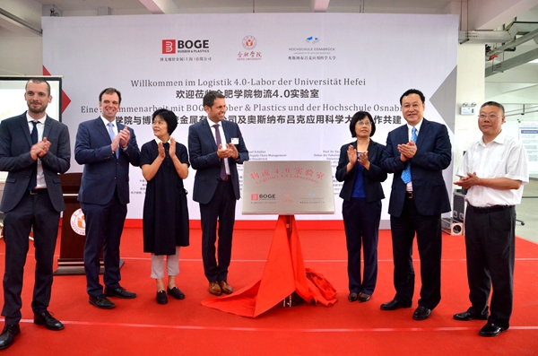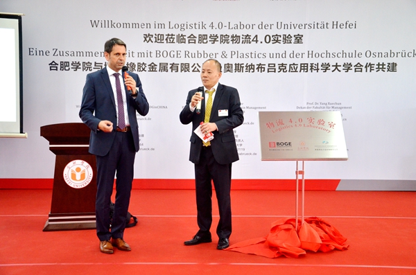在由合肥学院、德国奥斯纳布吕克应用科学大学及德国BOGE公司合作共建的物流4.0”实验室揭牌仪式上,合肥学院党委书记蔡敬民致辞,对德国下萨克森州经济代表团的到来表示由衷的欢迎。蔡敬民回忆了我校与德国奥斯纳布吕克应用科学大学的合作历史,两校30余年来在师生交流、科研合作、骨干教师培养、国际会议合作等领域开展有全方位的合作。两校共同申报的中德合作物流管理本科专业更是成为教育部批准的安徽省首个中外合作办学项目。此次中德合作物流4.0”实验室的建立,旨在进一步拓展校企合作领域,增强学生专业实践能力。他表示,合肥学院愿意继续为中德高校及企业间的合作不断发挥优势。德国BOGE(中国)公司代表王尔明对公司研究领域以及产能运营状况做了简单介绍。他提到,公司对 BOGE “工业4.0”现代化企业物流体系与中德合作物流4.0”实验室之间的合作充满期待,并邀请到场嘉宾访问BOGE公司、欢迎合肥学院学生赴BOGE公司就业。该实验室学术主任格斯宁博士就实验室具体情况、学生参与物流工具设计与控制的方式以及该实验室基础上课程与实践的深度融合等内容做了深入介绍。随后,在场中德嘉宾共同为中德合作物流4.0”实验室揭牌。