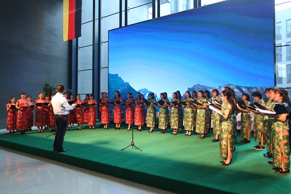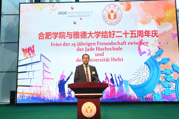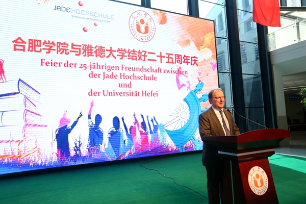 合肥学院与雅德大学结好二十五周年庆典活动在我校图书馆大厅举行。在观看了视频纪念短片后,蔡敬民与德国雅德大学代表科斯特教授分别致辞。双方回顾了两校合作历程后均表示将继续在现有合作基础上进一步深化友谊。赖斯部长发表讲话,他提到,合肥学院与雅德大学合作基础雄厚、交往密切,也推动了中德年轻人的交往互动,对双方来说都是一种智慧投资。庆典活动中,两校合作培养的338名学生中有部分代表也来到了现场发表感言,并向两所母校分别赠送了纪念品。合肥学院学生合唱团为到场嘉宾进行了表演,现场气氛和谐活泼。庆典结束后,赖斯部长及代表团一行在校园里共同种植下象征中德友谊的常青树。