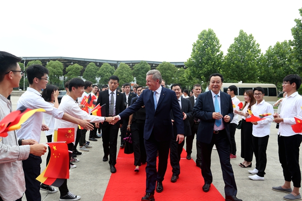 6月19日下午,充满热情和期盼的学生们站立在合肥学院图书馆报告厅大门两侧,手持中德两国国旗热烈欢迎武尔夫先生的再次到来。一路上,武尔夫主席多次驻足与师生代表亲切交流。