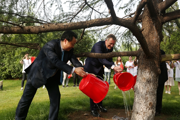 活动现场播放了武尔夫历次访问我校的视频,为武尔夫庆祝生日并合唱献花,气氛热烈。最后,武尔夫主席一行来到一期中德友谊树前,踏过红地毯,从等候在这里的合肥学院学生手中接过盛满中德友谊和希望之水,将水浇向2005年第一次来合肥学院时亲手栽下的友谊树。据悉,武尔夫曾两次访问合肥学院,2005年5月,武尔夫在合肥学院种下了一棵象征中德友谊的常青树——雪松,2008年10月在任德国下萨克森州州长时访问安徽,再次来到我校进行访问。九年来,友谊之树茁壮成长,武尔夫先生是合肥学院全体师生最值得尊敬、最值得骄傲的德国友人。