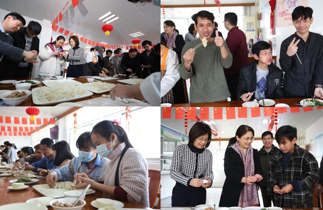 2021210日是庚子年农历腊月二十九,我校一期教工餐厅里洋溢着浓浓的年味,张灯结彩,一派喜气洋洋的景象。在国际教育学院精心组织下,学校为留校学生精心准备了年饭,校长吴春梅、副校长陈秀与留校的国际学生欢聚一堂,一起包饺子,同吃年饭,共迎新春佳节。