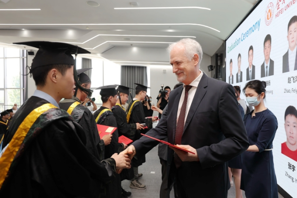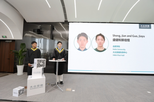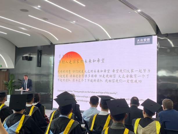 The morning of June 16 sees the graduation ceremony at Volkswagen Anhui of the first batch of “Seed Engineers” jointly trained by HFU and Volkswagen Group China. Wu Chunmei, HFU President, attends the ceremony together with Mr. Jens Pfitzinger, Volkswagen Group Executive Vice-president and Dr. Gabardi, CEO of Volkswagen Anhui.