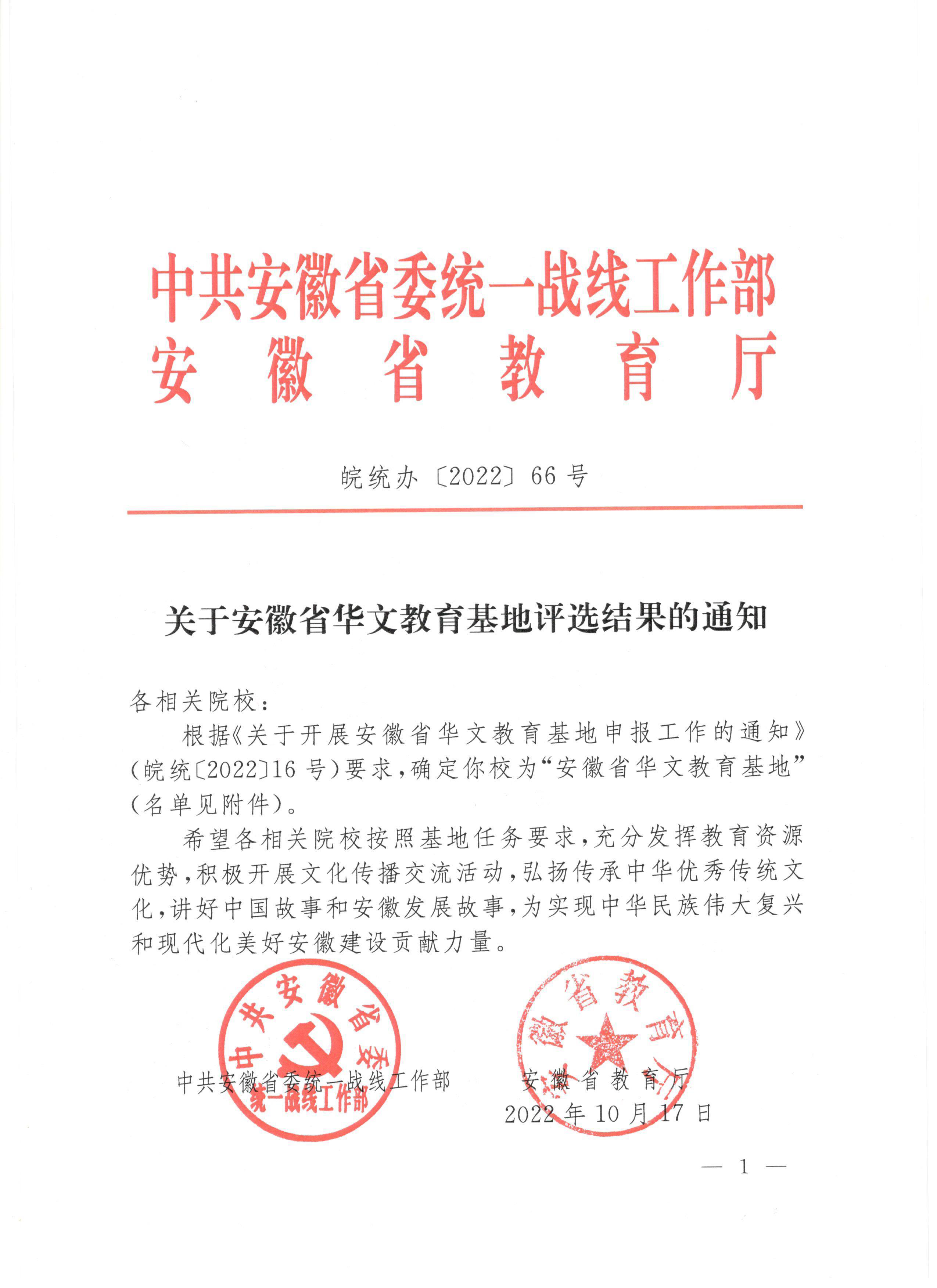 近日,安徽省华文教育基地授牌仪式在合肥市举行。省委常委、统战部部长张西明出席为首批基地授牌。省委统战部、省侨办和省教育厅负责同志参加授牌。经过评选和考察,我校获批成为首批安徽省级华文教育基地。