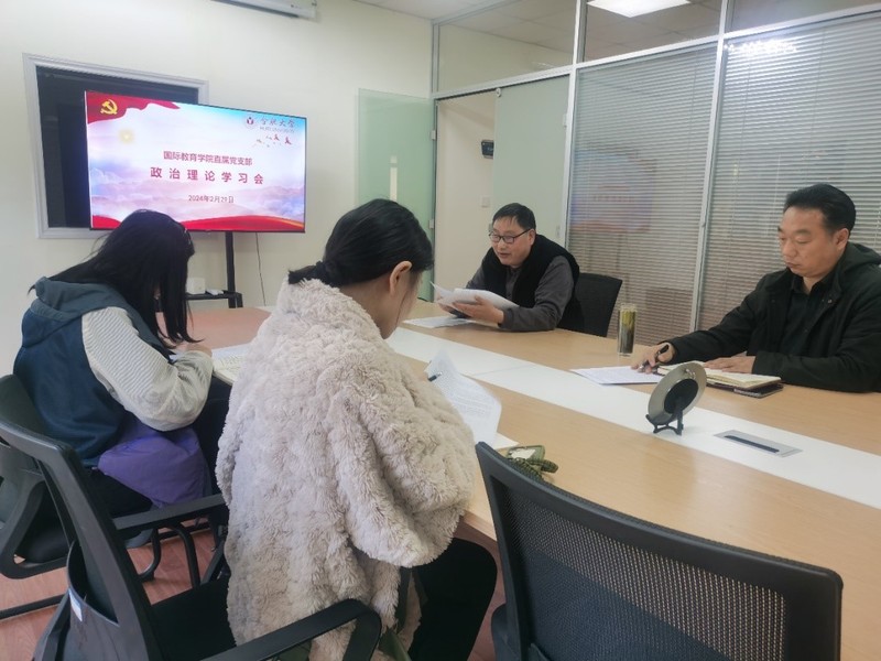 2月29日下午,国际教育学院直属党支部召开政治理论学习会,会议集中传达学习了习近平总书记在主持中央政治局会议审议主题教育总结报告和关于巩固拓展主题教育成果的意见时、在2024年春节团拜会上和同党外人士共迎新春会上的重要讲话精神,同时还共同学习了中共中央印发的《党史学习教育工作条例》《中国共产党纪律处分条例》《中国共产党巡视工作条例》等重要文件精神,支部书记方宗保主持会议。