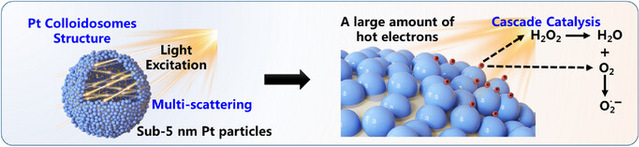 铂凭借其独特的d带结构以及在费米能级附近的高电子态密度,成为实现高效光催化反应的理想候选材料。然而,其实际应用受限于有限的光吸收能力与热载流子产生效率。本研究报道了Pt胶体球(Pt Cs)的制备——一种通过激光液相处理与电置换反应构建的、由超小铂纳米颗粒紧密堆积而成的亚100纳米空心结构。该结构具备从可见到近红外的宽谱吸收能力,有效促进了d带电子在近红外光激发下产生热载流子,进而显著提升了其催化氧化性能。Pt Cs在近红外光照下表现出优异的过氧化氢酶(CAT)和氧化酶(OXD)模拟活性,并成功应用于肿瘤光动力治疗,实现了显著的肿瘤生长抑制效果。这些结果表明,Pt Cs在近红外光催化及生物医学应用中具有广阔前景。(撰稿:计思涵;初审:蔡威盟;复审:朱三娥;终审:杨伟)