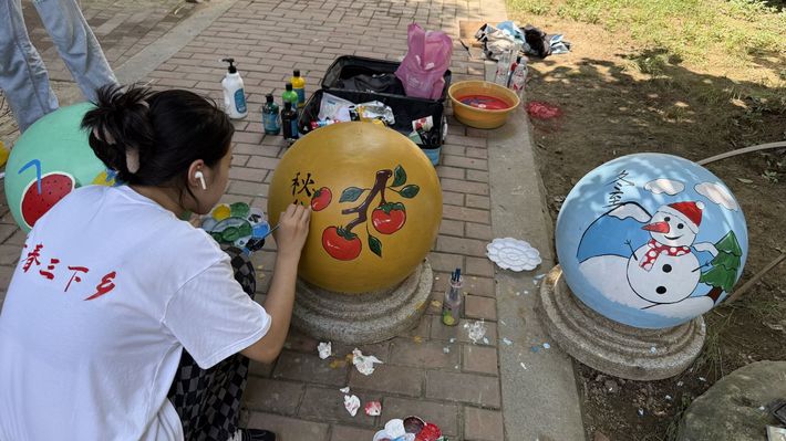 另一组成员则专注于“二十四节气”主题的创作。他们先用丙烯在石墩上打底,细致划分每个节气的代表元素。立春的嫩芽、夏至的麦穗、秋分的明月、冬至的雪花,这些带着季节特征的图案慢慢在石墩上显现出来。成员们也非常注重色彩的搭配,他们用颜色变化来表现四季的不同。成员们表示,希望通过这些图案让更多人了解二十四节气这一珍贵的文化遗产。