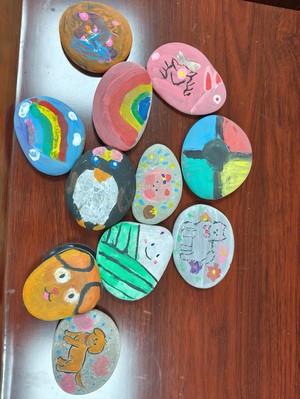 团队成员们将石头、画笔、丙烯颜料等工具分发给孩子们,带领孩子们对每一块石头进行创意绘画。在老师的指导下,孩子们对石头进行分类、清洗、创作,展现出各种图案的石头:有的像熊猫,有的像小狗……在丙烯颜料的帮助和师生共同的努力下,将原本单调的石头装饰地美轮美奂。