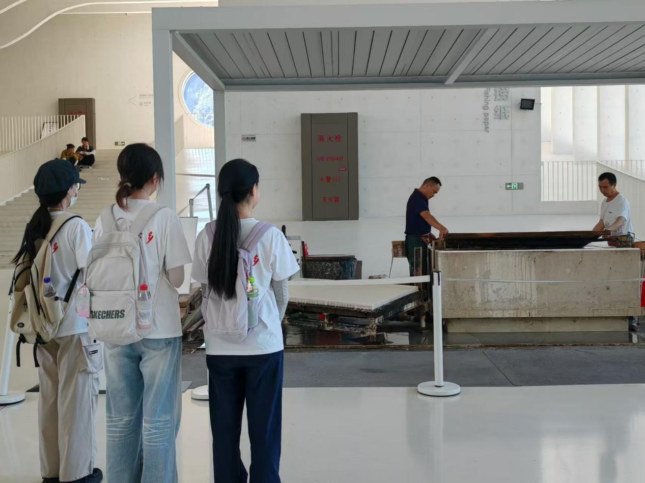 抵达宣纸文化园后,同学们首先被园区现代化的建筑风格与浓厚的文化氛围所吸引。随后,团队移步至中国宣纸博物馆。馆内陈列着从唐代至现代各时期的宣纸珍品,泛黄的古纸、名家书画真迹、历代制纸工具等一一陈列,仿佛翻开了一部宣纸的“活历史书”。在互动展区,学生们通过高清投影与触摸屏幕,动态观看了宣纸“选料、制浆、捞纸、晒纸、剪纸”等108道工序,让大家深刻感受到“一张宣纸,百道工序”背后,匠人倾付的耐心、专注与执着,那是流淌在岁月里,代代相传的匠心精神。