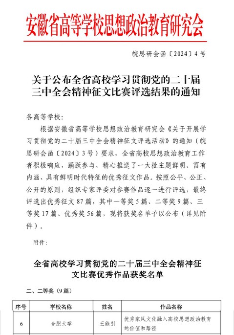 2024年11月19日,根据安徽省高等学校思想政治教育研究会《关于公布全省高校学习贯彻党的二十届三中全会精神征文比赛评选结果的通知》(皖思研会函〔2024〕4 号),我院王能引老师撰写的论文《优秀家风文化融入高校思想政治教育的价值和路径》荣获二等奖。