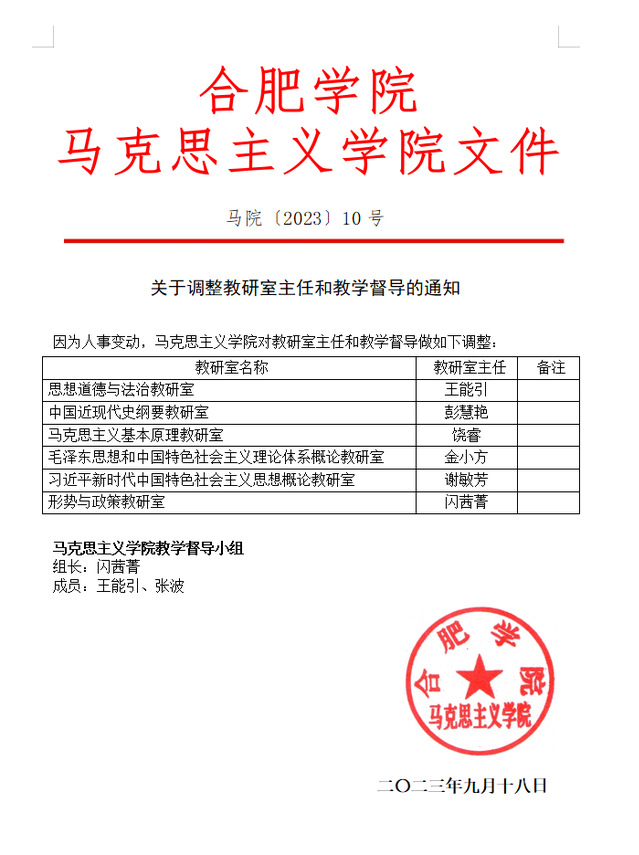 关于调整教研室主任和教学督导的通知(马院〔2023〕10号).doc