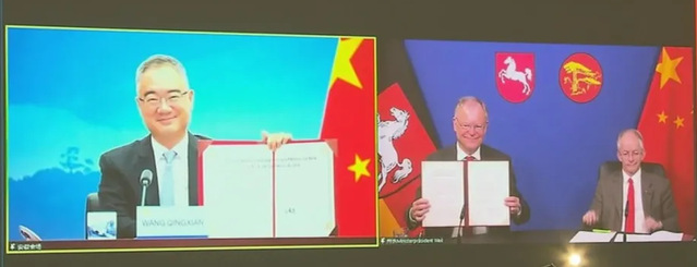 王清宪与魏尔线上签署了《中华人民共和国安徽省人民政府与德意志联邦共和国下萨克森州政府关于进一步深化友好省州关系合作意向书》并互赠礼品。