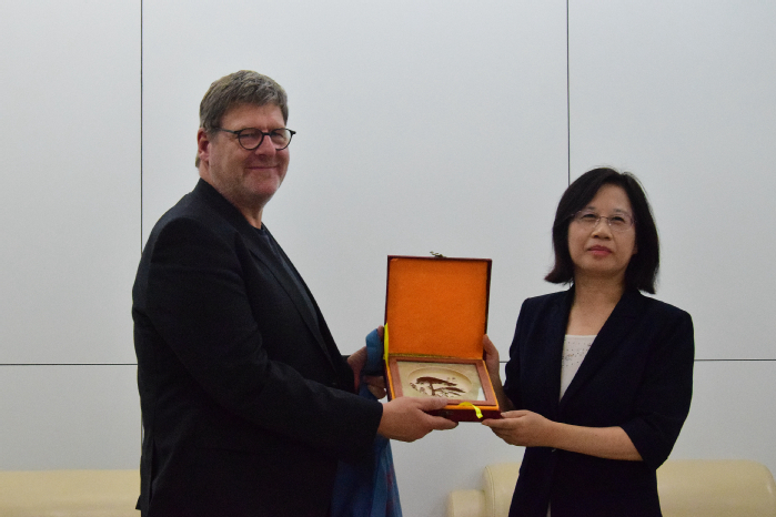 院长吴春梅在图书馆贵宾室会见来宾,副院长陈秀、国际交流合作处、大众学院负责人陪同,双方就加强双边合作与大众学院建设达成系列共识。