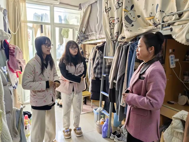 为深入了解我院学生的思想动态和生活情况,2024年12月6日,语言文化与传媒学院党委副书记张爱萍、副院长查金萍带领全体辅导员前往各社区宿舍实地察看学生学习、生活情况。