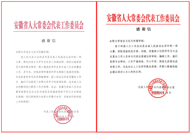 2025年1月19日至24日,我院中文系汉语言文学专业沈石丽、刘晓、宋慧婷等三位同学圆满完成安徽省第十四届人民代表大会第三次会议的实习任务,受到省人大常委会代表工作委员会的高度肯定,并向我院发来感谢信。