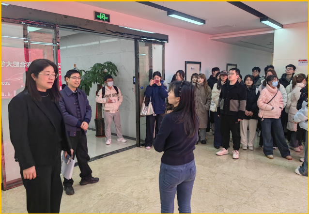 在安策智库行政主管王俊霞引导下,师生先后参观了公司开放式办公区、社科研究中心、档案管理室和党建文化厅,了解数据监测、政策分析等实务场景,现场观摩智库分析系统与数字化档案管理技术的运行模式。