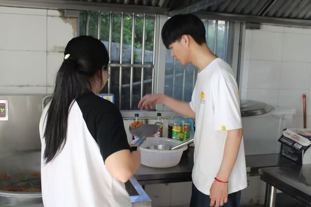 采购归来后,厨房立刻变身成“战场”:有人负责清洗食材,水流声与菜叶的沙沙声交织;有人熟练地将青椒去籽切块、番茄去皮切瓣,刀工精准而利落;有人守着灶台调控火候,油星在锅中跳跃,香气随着锅铲的翻动逐渐弥漫。从洗切到烹饪,每一个环节都井然有序,每一道工序都饱含着对团队成员的关切。中午11:00,后勤组成员已为排队等候的团队成员备好热饭。青椒炒肉的清香混合着番茄炒蛋的酸甜,绿豆汤的清润漫过舌尖,这顿由后勤组精心准备的午餐,让顶着烈日开展调研与教学的队员们直呼暖胃更暖心。察觉菜品分量不足时,后勤组迅速决定加炒蛋炒饭。金黄的蛋液裹着米饭翻涌,香气很快弥漫厨房,不多时,这锅带着温度的蛋炒饭便端上了餐桌,为队员们补充了满满的能量。