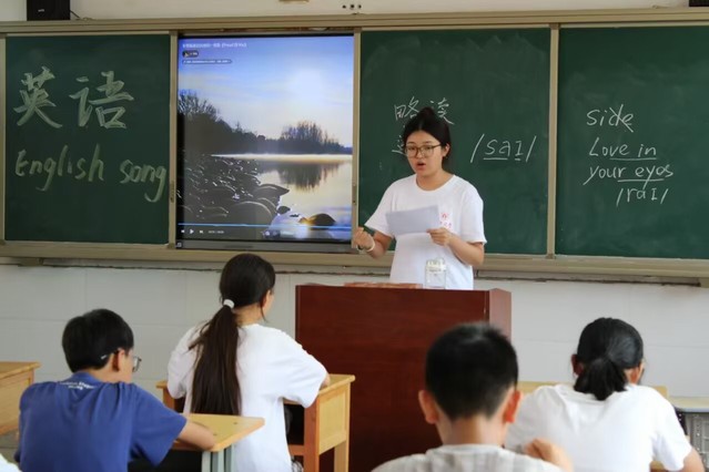 课堂伊始,刘嘉慧以一首轻快动听的英语歌《Proud of You》导入课程。老师逐句教唱,耐心纠正同学们的发音,在优美的旋律中,学生们逐渐熟悉英语的语音语调,原本略显拘谨的课堂氛围被打破,充满了欢声笑语。学生们跟随着老师的节奏,从最初的羞涩不敢开口,到后来自信放声歌唱,每一个音符都饱含着他们对英语学习的渴望与喜爱。