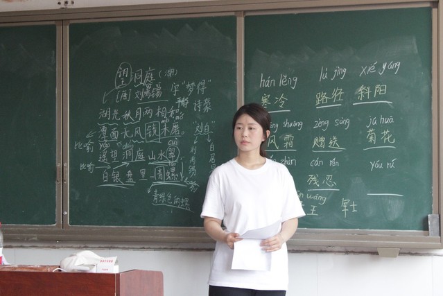 课堂上,教学组成员们引领孩子们穿越历史长廊,深入品读诗作。借助课件与板书,诗句的精妙意境得以生动呈现。讲解《江南逢李龟年》时,杜甫笔下岐王宅里的旧日繁华与江南落花时节的重逢感慨,在关键词“重逢→离别/永别”、“以乐景衬衰情”的剖析中被层层剥开,辅以诗人个人遭际与时代沧桑的解读,引导孩子们体会诗中深沉的家国情怀。而赏析《望洞庭》时,则紧扣“诗豪”刘禹锡以湖光秋月入画的奇绝想象,聚焦“潭面无风镜未磨”及“白银盘里一青螺”的精妙比喻,引导孩子们在诵读间想象月夜洞庭的澄澈空灵与君山的青翠玲珑。